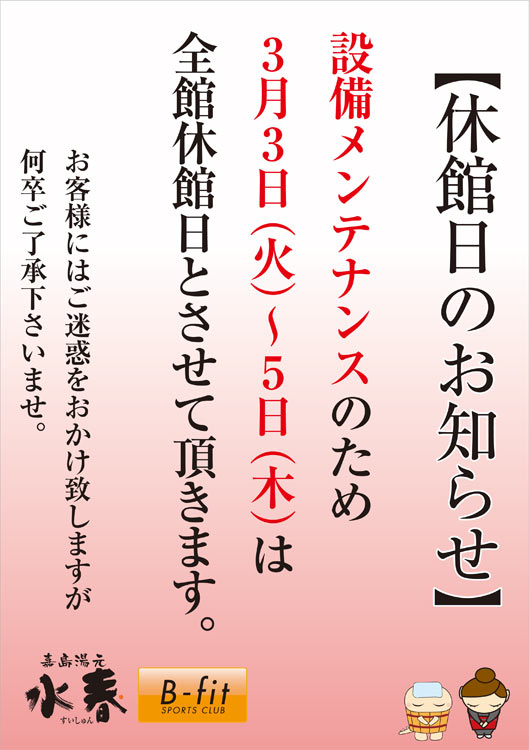 2026年3月3日~5日 休館日のお知らせ2026.02.102026年3月3日~5日 休館日のお知らせです。 3月3日~5日は設備メンテナンスのため、休館日とさせていただきます。 お客様にはご迷惑をおかけいたしますが、何卒ご了承くださいませ。 Tweet Share Hatena Pocket RSS feedly Pin it 3月からのレッスンプログラム 前の記事