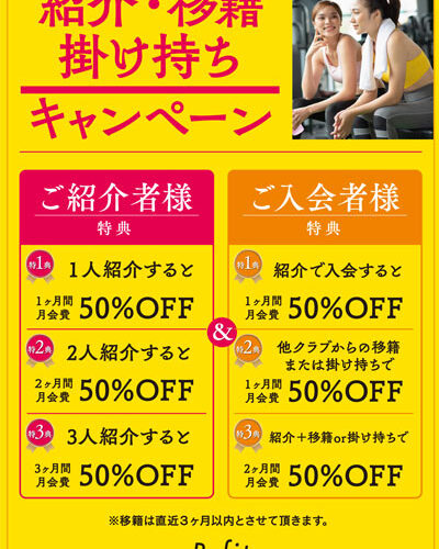 紹介・移籍・掛け持ちキャンペーン2026.03.1 紹介・移籍・掛け持ちキャンペーンご紹介様特典特典1 1人紹介すると…1ヶ月間 月会費 50%OFF!特典2 2人紹介すると…2ヶ月間 月会費 50%OFF!特典3 3人紹介すると…3ヶ月間 月会費 50%OFF!ご入会様特典特典1 紹介で入会すると…1ヶ月間 月会費 50%OFF!特典2 他クラブからの移籍、または掛け持ちで…1ヶ月間 月会費 50%OFF!特典3 紹介+移籍or掛け持ちで…2ヶ月間 月会費 50%OFF!