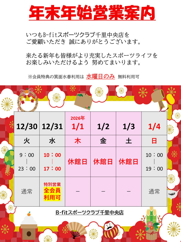 年末年始の営業時間について2025.11.2512月31日(水) 10:00~17:00 特別営業(レッスンは、スタッフレッスン+インストラクター1名のみレッスン 太陽礼拝) 会員特典の箕面水春無料利用は水曜日のみ可能(三箇日は利用不可)2026年 1月1日(木)~3日(土) 休館日 2025年11月24日 特別プログラム 前の記事 2025年12月からのレッスンプログラム 次の記事
