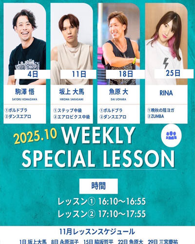 10月 スペシャルレッスン2025.09.30 2025年10月 WEEKLY SPECIAL LESSON開催時間 1. 16:10 ~ 16:55 2. 17:10 ~ 17:55 Tweet Share Hatena Pocket RSS feedly Pin it