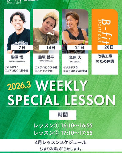 2026年3月 スペシャルレッスン2026.03.2 2026年3月 WEEKLY SPECIAL LESSON開催時間 レッスン1. 16:10 ~ 16:55 レッスン2. 17:10 ~ 17:55 Tweet Share Hatena Pocket RSS feedly Pin it