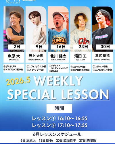 2026年5月 スペシャルレッスン2026.04.23 2026年5月 WEEKLY SPECIAL LESSON開催時間 レッスン1. 16:10 ~ 16:55 レッスン2. 17:10 ~ 17:55 Tweet Share Hatena Pocket RSS feedly Pin it